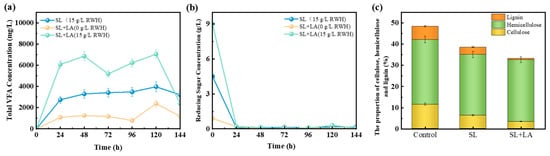 At the same time, the introduction of LA brought about a significant change in the composition of cellulose, hemicellulose, and lignin across the reactors. As shown in Figure 3c, there was a marked reduction in the levels of both cellulose and lignin following the addition of LA. In the control group, cellulose and lignin accounted for 11.53% and 6.29%, respectively. However, cellulose and lignin contents reduced to 6.33% and 3.47% in the SL group and further dropped to 3.41% and 0.66% in the SL + LA group. The results indicated that LA could degrade lignin, which led to the easier utilization of cellulose and hemicellulose for converting into VFAs. In addition, it was also found that the addition of SL and LA pretreatment had little effect on the hemicellulose content. Generally, the evident decrease of cellulose and lignin indicated that the addition of SL and LA could increase the bioavailable substrates, which could enhance VFA production during anaerobic fermentation.