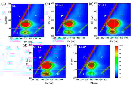 Three-dimensional excitation–emission matrix (3D-EEM) spectra of the fermentation broth on day 6 in various experimental groups: (a) SL; (b) SL + AA; (c) SL + LA; (d) SL + LY; (e) SL + AP.