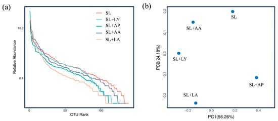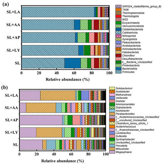 Microbial communities in various groups were examined through high-throughput sequencing methods. As shown in Figure 5a, bioenzymes reduced the diversity of the anaerobic microbial community. Among them, SL + LA pretreatment had the lowest species abundance and homogeneity, which might be due to the enrichment of functional hydrolysis and acid-producing bacteria. As shown in Figure 5b, PCoA analysis further exhibited that compared with the SL group, SL + LA pretreatment showed the greatest variability in microbial species, while SL + AA possessed the least variability, indicating that different bioenzymes could significantly influence microbial community structures [].