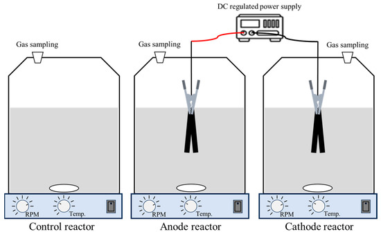 The schematic diagram of the experimental setup is shown in Figure 1. The electrodes used for the voltage application were made of activated carbon fiber felt (Shibata Scientific Technology Ltd., Tokyo, Japan) with dimensions of 40 mm (length) × 10 mm (width) × 2 mm (thickness). Each electrode was attached using an alligator clip. The electrodes were connected to a DC-regulated power supply (A&D Co., Ltd., Tokyo, Japan) via vinyl-insulated electrical wires. The power supply was operated in constant voltage (CV) mode, and a continuous DC voltage was applied throughout the fermentation period. During the fermentation, the activated carbon fiber felt electrodes were fixed in position to ensure that they remained fully submerged in the liquid phase at all times.