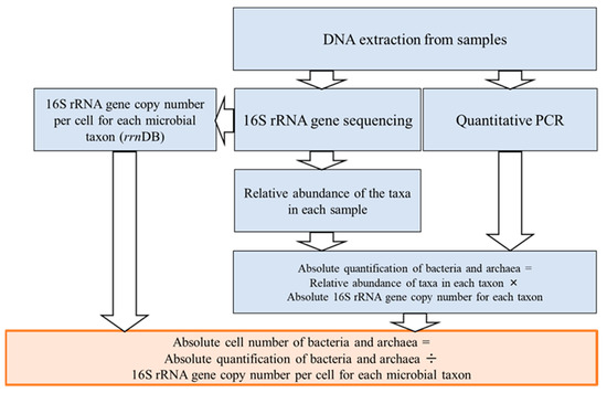 After the fermentation tests, samples were collected by opening the screw-cap of the fermentation bottles. The organic acid concentrations in the liquid phase were determined using a high-performance liquid chromatography system (Shimadzu Corporation, Kyoto, Japan) equipped with a system controller (SCL-10A VP, Shimadzu, Kyoto, Japan), degasser (DGU-14A, Shimadzu, Kyoto, Japan), pump (LC-10AD VP, Shimadzu, Kyoto, Japan), autosampler (SIL-10AD VP, Shimadzu, Kyoto, Japan), column oven (CTO-10AC VP, Shimadzu, Kyoto, Japan), and conductivity detector (CDD-10A VP, Shimadzu, Kyoto, Japan). Separation was performed using a Shim-pack SCR-102H column (Shinwa Kako Corporation, Kyoto, Japan) with 5 mM p-toluenesulfonic acid solution as the mobile phase. For microbial community structure analysis, 1.0 mL of each sample was transferred into a 2.0 mL microtube and subsequently stored at −60 °C. The methodology used to analyze the microbial community is illustrated in Figure 2. Microbial DNA was extracted using the FastDNA SPIN Kit for Soil (MP Biomedicals, Santa Ana, CA, USA). The V4 region of the 16S rRNA gene was amplified by PCR using the primers 515F (5′-GTGYCAGCMGCCGCGGTAA-3′) and 806R (5′-GGACTACNVGGGTWTCTAAT-3′), and sequencing was performed on the MiSeq platform (Illumina, San Diego, CA, USA). The sequencing data were processed using QIIMM2. To quantitatively analyze the microbial community, quantitative PCR (qPCR) was conducted using the primers described above and a real-time thermal cycler (TP1010, Takara Bio Inc., Shiga, Japan). The number of microbial cells present in the sludge was estimated by integrating the next-generation sequencing (NGS) results and qPCR data and comparing it with a 16S rRNA gene copy number database (rrnDB).