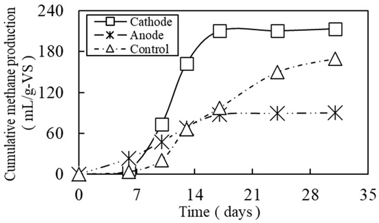 The cumulative methane production per gram of volatile solids (VSs) in each experimental reactor is shown in Figure 3. In the cathode reactor, methane production increased sharply after day 7, reaching approximately 210 mL/g-VS by day 30, with a methane concentration of 80%. In the control reactor, methane production increased gradually from day 0, reaching approximately 170 mL/g-VS on day 30, with a methane concentration of 64%. In the anode reactor, methane production began to increase after day 10, reaching approximately 80 mL/g-VS by day 30, with a methane concentration of 50%. The methane production and concentration were higher in the cathode reactor than in the control and anode reactors, which was likely due to enhanced methanogenesis by the hydrogenotrophic methanogens. This result is consistent with the findings of Zhao et al., who reported that hydrogenotrophic methanogens became dominant at the cathode, which enhanced methane production [19]. It is well established that hydrogenotrophic methanogens require not only electrons but also protons and carbon dioxide to produce methane. Traditionally, it has been assumed that in MET systems, protons and carbon dioxide are generated by the microbial degradation of organic matter at the anode and subsequently diffuse through the liquid phase between the electrodes, enabling hydrogenotrophic methanogens at the cathode to carry out methanogenesis. However, the findings of this study demonstrated that even in a methane fermentation reactor equipped solely with a cathode, the protons and carbon dioxide generated by the microorganisms present on the cathode surface alone were sufficient to support methane production by hydrogenotrophic methanogens.