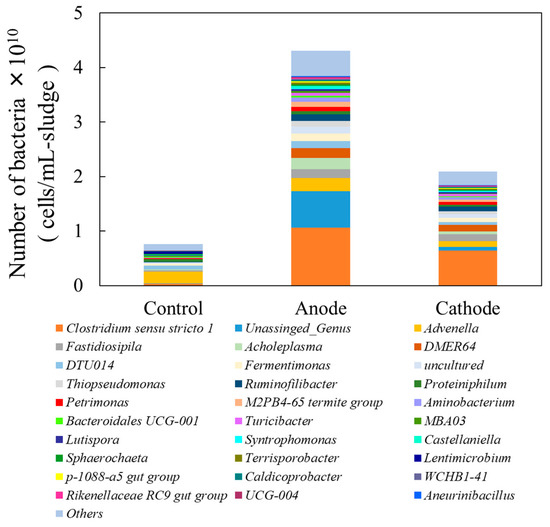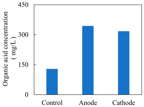 The number of bacteria at the genus level in each experimental reactor is shown in Figure 4. In this figure, the top 30 bacterial genera are presented in descending order based on their absolute abundance. Genera ranked below 31st each accounted for no more than 0.74% of the total bacterial count, suggesting that their impact on the overall results of this study is likely minimal. These lower-abundance genera (31st and below) were grouped as “Others,” and their relative abundances were calculated as 9.15% in the control reactor, 10.71% in the anode reactor, and 11.75% in the cathode reactor. When comparing the total bacterial counts across the experimental reactors, the anode reactor exhibited the highest bacterial density, with approximately five times more bacterial cells per milliliter of sludge than the control reactor and approximately twice as many as the cathode reactor. Zhang et al. reported that bacteria involved in methane fermentation were more abundant at the anode [21]. In the present study, quantitative analysis revealed that the anode reactor contained the highest number of bacterial cells. Both Clostridium sensu stricto 1 and Fastidiosipila, whose absolute microbial abundance increased in the anode and cathode reactors compared to the control, belong to the phylum Firmicutes and have been reported to play significant roles in substrate hydrolysis and organic acid production during methane fermentation [22,23]. The organic acid concentrations measured in each reactor are shown in Figure 5. The organic acid concentration after the fermentation was highest in the anode reactor, followed by the cathode reactor, and lowest in the control reactor. This further suggests that the acid-producing bacteria Clostridium sensu stricto 1 and Fastidiosipila played a predominant role.