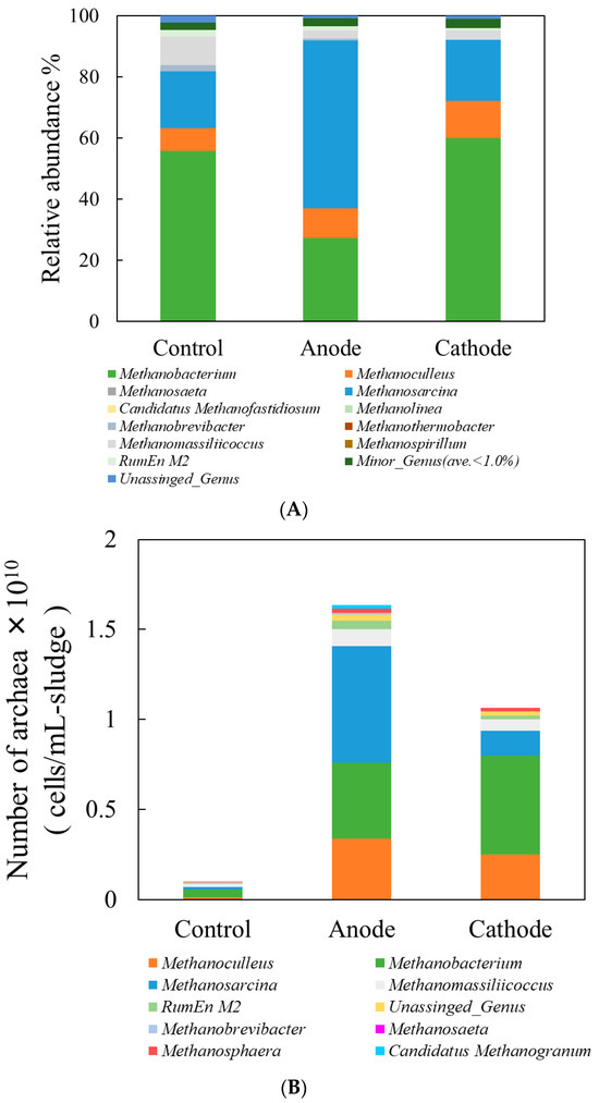 The (A) relative abundance and (B) absolute microbial abundance of archaea at the genus level in each experimental reactor are shown in Figure 6. Zhu et al. reported that the relative abundance of archaea on the cathode was higher than on the anode, with a particularly high proportion of hydrogenotrophic methanogens, which contributed to enhanced methane production on the cathode [26]. In the present study, the combined relative abundance of the hydrogenotrophic methanogens Methanoculleus [27] and Methanobacterium [28] was approximately 38% in the anode reactor and 71% in the cathode reactor, consistent with previously reported trends, as shown in Figure 6A. However, when focusing on the absolute microbial abundance shown in Figure 6B, the total number of archaea per milliliter of sludge was highest in the anode reactor, being approximately 17 times greater than in the control reactor and about 1.5 times greater than in the cathode reactor. Consequently, the total number of hydrogenotrophic methanogens (Methanoculleus and Methanobacterium) was nearly equivalent between the anode and cathode reactors. This can be attributed to the overall microbial cell count in the anode reactor (1.635 × 1010 cells/mL-sludge) being higher than that in the cathode reactor (1.064 × 1010 cells/mL-sludge). In the case of the control reactor, the relative abundance shown in Figure 6A might suggest a higher proportion of hydrogenotrophic methanogens compared to the anode reactor. However, because the total number of archaea in the control reactor was only about 9.8 × 108 cells/mL-sludge, the absolute microbial abundance shown in Figure 6B clearly indicates that the number of hydrogenotrophic methanogens was substantially lower than in the anode and cathode reactors.