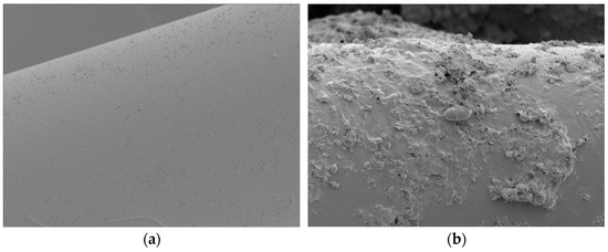 SEM images of the cathode before and after the experiment are shown in Figure 7. Before the experiment, the activated carbon felt exhibited a smooth surface. In contrast, after the experiment, rod-shaped microorganisms were observed adhering to the electrode surface along with accumulated organic matter. Previous studies have reported that smooth carbon fiber surfaces are generally unfavorable for microbial attachment [30]. However, the adhesion of organic matter and microorganisms observed in this study suggests that even carbon felt with a smooth surface can effectively function as a carrier for microbial colonization and organic matter retention. These findings imply that the application of voltage may have altered the surface properties of the electrode, thereby enhancing its capacity to retain both microorganisms and organic matter.
