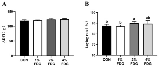 Effects of different supplementation levels of FDG on laying performance. (A) Average daily feed intake (ADFI) and (B) laying rate of hens. Values represent the means of 6 replicates per group. Means with different superscripts (a, b) are significantly different (p < 0.05). CON = control group; 1% FDG = control diet supplemented with 1% fermented distiller’s grains; 2% FDG = control diet supplemented with 2% fermented distiller’s grains; 4% FDG = control diet supplemented with 4% fermented distiller’s grains.