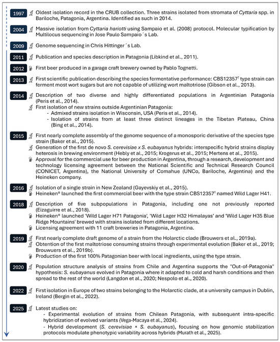 Timeline of S. eubayanus: key events and major scientific breakthroughs. Events preceded by the microscope symbol indicate notable advances in scientific research, while those marked with the pint of beer symbol constitute events of significance for the brewing industry. CRUB: acronym for Centro Regional Universitario Bariloche culture collection. Citations included in the figure, in order of appearance, correspond to the following sources: [5,10,13,14,15,16,17,18,19,20,21,22,23,24,25,26,27,28,29].