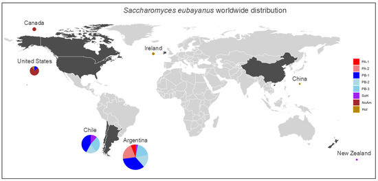 Worldwide distribution of S. eubayanus. The size of the circles represents the number of isolations: Argentina (166), Chile (82), United States (22), Canada (4), Ireland (2), New Zealand (1), and China (1). Each color represents the presence of different subpopulations as shown in the legend. Data collected from Langdon et al. [16] and Nespolo et al. [17].