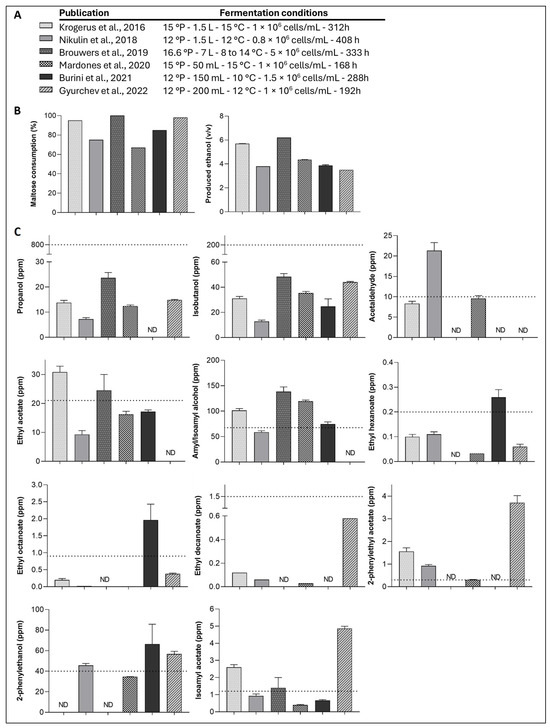 Overview of fermentative characteristics of S. eubayanus-type strain in beer wort. (A) Fermentative conditions in each research work. (B) Fermentation performance. (C) Volatile compounds production (mg/L). The dotted lines represent the flavor threshold for each compound; ND: compound not determined. Citations included in the figure, in order of appearance, correspond to the following sources: [26,36,55,56,57,58].