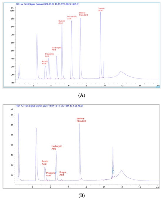 The analysis of short-chain fatty acids was conducted using GC-FID, according to the analytical methods of Gu et al. []. The gas chromatography (GC) machine (7890B Agilent, Santa Clara, CA, USA) was coupled with a flame ionization detector (FID), an autosampler (7693 Agilent, CA, USA), and an autoinjector (G4513A Agilent, CA, USA). A SGE BP21 capillary column (12 × 0.53 mm internal diameter (ID) with 0.5 µm film thickness, SGE International, Ringwood, VIC, Australia, P/N 054473) and a retention gap kit (including a 2 × 0.53 mm ID guard column, P/N SGE RGK2) were attached. The carrier gas was helium with a flow rate of 14.4 mL/min. The detailed conditions used for GC-FID were as follows: 1 µL sample was injected; the oven temperature was set at 100 °C for 30 s, then increased to 180 °C at 6 °C/min for 1 min, and then increased to 200 °C at 20 °C/min for 10 min; the FID temperature was set at 240 °C; the inlet temperature was set at 200 °C; and the supplemental gases were nitrogen, hydrogen, and air at flow rates of 20, 30, and 300 mL/min, respectively. Short-chain fatty acids were calculated by substituting the sample peak area directly into the following standardized equation []: