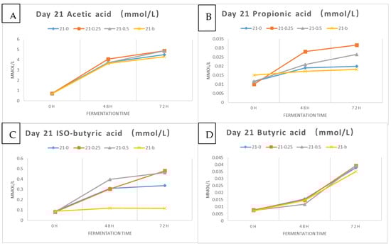SCFA production in samples stored for 21 days. (A) Acetic; (B) Propionic; (C) Iso-butyric; (D) Butyric acids.