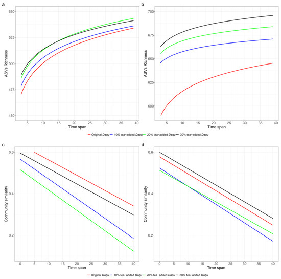 STRs and TDRs have been widely employed to investigate plant and animal communities [38,39,40,41] and to analyze microbial succession in controlled microcosm systems [42]. The slope of an STRs reflects the rate at which novel taxa are detected in a community over time, with steeper slopes indicating a higher rate of new taxon introduction [38]. In our study (Figure 1a,b), STRs analysis revealed that both bacterial and fungal communities across all Daqu types exhibited significant temporal increases in species richness (p < 0.001). Given that Daqu fermentation occurs in open environments, newly detected taxa likely originated from low-abundance populations in the initial raw materials or were introduced externally during the process. Although the probability of external microbial acquisition was consistent across the four Daqu types under identical fermentation conditions, STRs slopes varied among them, suggesting that novel taxa primarily derived from low-abundance taxa in the starting materials. This aligns with previous findings that most taxa in ecosystems persist over time, with community composition changes driven by fluctuations in relative abundance rather than extinction or recolonization [43]. Fungal STRs slopes ranged from 9.89 to 21.92, while bacterial slopes were higher (20.39–24.84), indicating progressive detection of novel taxa as fermentation progressed. Notably, intercept values for both bacteria and fungi increased with tea addition, suggesting that tea promoted microbial accumulation and enhanced overall community richness. However, higher tea concentrations correlated with reduced STRs slopes, indicating a slower rate of novel taxon emergence. This may be attributed to two factors: the introduction of exogenous microbes via tea, which could alter competitive dynamics, and the reduced availability of starch (a key carbon source) as tea proportion increases, potentially leading to resource limitations or intensified microbial competition. For comparison, STRs slopes in natural habitats (e.g., air, seawater, soil, freshwater, flowers) range from 0.24 to 0.61 [42], while those in polluted environments range from 0.7 to 0.8 [44,45]. Notably, the rates of novel taxon detection observed in our Daqu fermentation system (fungal slopes: 9.89–21.92; bacterial slopes: 20.39–24.84) were substantially higher than these values, underscoring the unique microbial succession dynamics in this open, resource-rich fermentation environment.