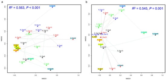 NMDS ordination plots depicting the fermentation trajectories of (a) bacterial and (b) fungal communities across four Daqu types, based on Bray–Curtis dissimilarity metrics. Sample centroids, indicating significant separation among Daqu treatments, are marked in the plots. The four Daqu types are labeled as follows: A—(Original Daqu), B—(10% tea-added Daqu), C—(20% tea-added Daqu), and D—(30% tea-added Daqu). Temporal dynamics are highlighted by centroids with yellow-shaded backgrounds (Day 1, start of fermentation) and cyan-shaded backgrounds (Day 40, end of fermentation), illustrating shifts in microbial community structure over the fermentation period.