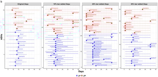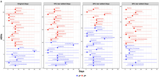 TDRs provided insights into community succession dynamics, with temporal turnover slopes (w) estimating the rate of structural change over time. A slope of zero indicates no temporal change, while more negative slopes reflect faster community turnover [46]. In our study (Figure 1c,d), TDRs were statistically significant for microbial communities across all Daqu types. However, regardless of tea addition, the w values were notably lower than those reported in other studies [47,48,49], indicating a relatively slow rate of community turnover. Moreover, tea addition did not significantly accelerate community turnover. This suggests that while STRs revealed relatively high species turnover, the corresponding w values remained low, implying that community succession was primarily driven by shifts in the relative abundance of dominant taxa rather than the introduction of newly detected species. Additionally, TDRs (Figure 1c,d) showed substantial variation in constants across Daqu types, indicating that while tea addition did not drastically alter the overall community turnover rate, it did influence community structure. This led to increased temporal divergence among Daqu types, as illustrated by the NMDS plot (Figure 2a,b), which indicated that bacterial communities adapted rapidly to environmental changes, while fungal communities exhibited slower dynamics. A previous study [50] using TITAN2 effectively identified precise time thresholds, highlighting subtle shifts in microbial communities that are critical for ecosystem stability. The current study (Figure 3a,b) revealed nuanced timing in bacterial and fungal shifts. In the original Daqu, significant bacterial shifts occurred between Day 6 and Day 12, while fungal shifts emerged between Day 12 and Day 15. However, tea addition extended the bacterial shift response to Day 15 and advanced the fungal response to Day 6, prolonging it until Day 30. Moreover, a higher tea proportion increased the number of fungal taxa exhibiting shift responses beyond Day 15. These findings suggest that tea addition expanded the response window for microbial abundance changes, enabling a greater number of microorganisms to remain within a controlled range.