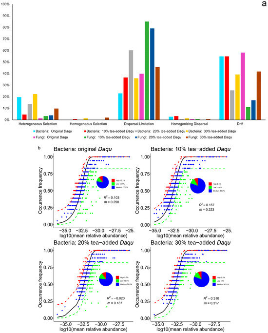 Analysis of community assembly processes in different Daqus. (a) Bar plot showing the relative importances (%) of heterogeneous selection, homogeneous selection, dispersal limitation, homogenizing dispersal and drift for bacterial and fungal communities. Fit of Sloan’s neutral model for (b) bacterial and (c) fungal communities. The continuous black line represents the best-fitting neutral model. The ASVs that occur more frequently than predicted by the model are shown in red points while those that occur less frequently than predicted are shown in green points. Dashed lines represent 95% confidence intervals around the model prediction. The ASVs within the confidence intervals (blue points) followed the neutral process. m indicates the estimated migration rate, and R2 indicates the fit to the neutral model. Pie chart displaying the occupancies of the ASVs shown in red, blue and green points.