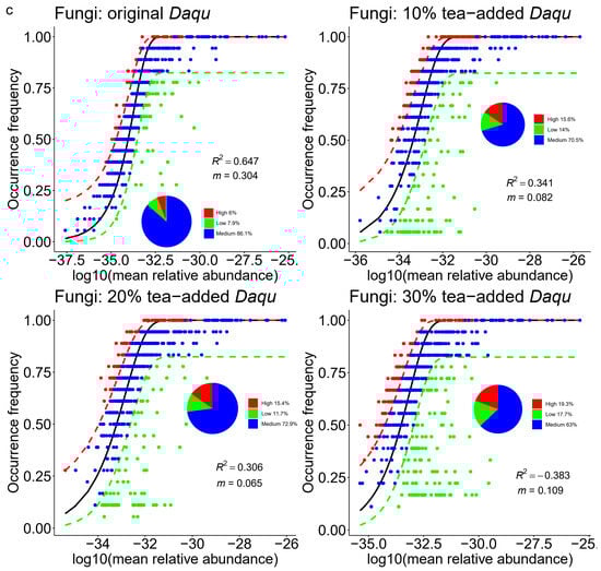 We examined the assembly mechanisms of microbial communities in original and tea-supplemented Daqu by combining null-model and Sloan neutral-community analyses (Figure 4). In bacteria, stochastic processes dominated every treatment (77–94%). Drift alone explained 55% of assembly in original Daqu (Figure 4a, Table S2). Tea progressively altered these dynamics. At 10% tea, dispersal limitation rose to 37% yet stochasticity remained 94%, indicating that resource constraints amplified random assembly. This trend intensified at 20% tea, with dispersal limitation reaching 60% while stochasticity stayed at 86%. By 30% tea, 23% of assembly was driven by heterogeneous selection, revealing emerging niche specialization under high tea concentrations. Fungi followed a similar trajectory, shifting from 99% stochasticity in original Daqu to 12% deterministic assembly (10% heterogeneous plus 2% homogeneous selection) at 30% tea, reflecting substrate-driven filtering of tea-tolerant taxa.