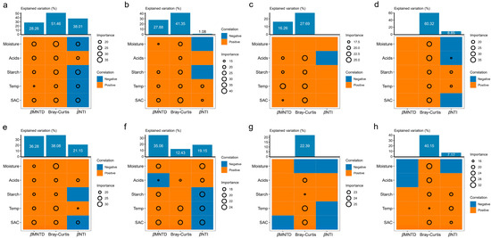 Contributions of endogenous factors to each β-diversity metric for bacterial communities in (a) Original Daqu, (b) 10% tea-added Daqu, (c) 20% tea-added Daqu, and (d) 30% tea-added Daqu, and fungal communities in (e) Original Daqu, (f) 10% tea-added Daqu, (g) 20% tea-added Daqu, and (h) 30% tea-added Daqu, as determined by a random forest regression model. Circle size indicates variable importance (percent increase in mean squared error), while colors represent the direction (positive/negative) of the Spearman correlation. The bars display the total variation in β-diversity metrics explained by the endogenous factors across distinct Daqus.