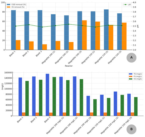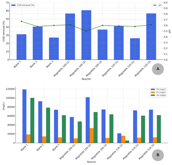 (A) COD removal rates after photofermentation. (B) Results of TS, FS, and VS analysis after photofermentation.