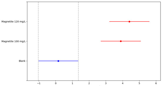 The Tukey’s Honestly Significant Difference (HSD) test identified which treatments resulted in significantly higher H2 production. The outcome is illustrated in Figure 4, where each horizontal line represents the 95% confidence interval of the mean difference between a pair of groups. The central dot indicates the observed mean difference; red lines denote statistically significant differences, whereas the blue line represents a pair without significant difference. In summary, the treatments with magnetite (100 and 120 mg/L) showed statistically significant differences when compared to the control group; however, no significant difference was found between the two magnetite concentrations.