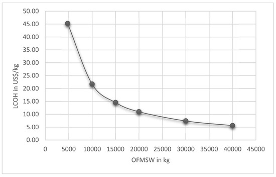 LCOH variation as a function of OFMSW to be digested in the dark fermentation reactor.