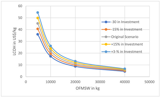 LCOH variation as a function of OFMSW to be digested in the dark fermentation reactor in function of the investment.