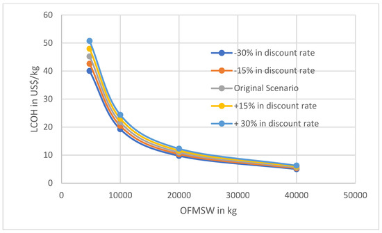 LCOH variation as a function of OFMSW to be digested in the dark fermentation reactor in function of the discount rate.