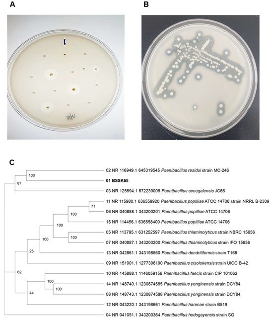 Isolation and identification of P. residui BSSK58. (A) Clear zone surrounding selected P. residui BSSK58 colony on MA. (B) Growth performance of P. residui BSSK58 colonies treated with CPC on MA. (C) Phylogenetic trees based on 16S rRNA sequences of strain P. residui BSSK58 and other bacillus species. Numbers at nodes represent bootstrap support values from 1000 replicates (only values >50% are shown).