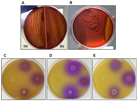 The hemolytic activity was assessed on 5% horse blood agar. P. residui BSSK58 exhibited γ-hemolysis, characterized by the absence of visible lysis around the colonies (Figure 2B), whereas positive controls (S. aureus and B. subtilis) showed clear β- and greenish α-hemolytic zones, respectively (Figure 2A).