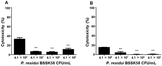 Assessment of P. residui BSSK58′s cytotoxicity in human intestinal epithelial cells using LDH release assay. (A) Caco-2 cells; (B) HT-29 cells. Cells were exposed to increasing concentrations of viable P. residui BSSK58 (4.1 × 105 to 4.1 × 108 CFU/mL) for 24 h. The data are expressed as the percentage normalized to the untreated control cells (0%). Values are the means ± SD (n = 3), as determined by one-way ANOVA Dunnett’s multiple comparison test. *** Means with different letters are significantly different (p < 0.0001).