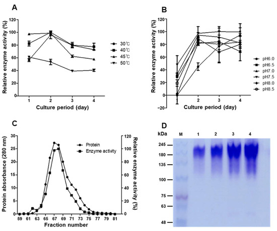 Optimization of production and purification of enzyme from P. residui BSSK58. (A) Optimal temperature. (B) Optimal pH. (C) Elution profile of BSSK58 hyaluronidase obtained using gel filtration chromatography. (D) Native PAGE of BSSK58 hyaluronidase. Protein marker is shown in lane M, and lanes 1–4 (5, 10, 20, and 30 µg) show purified BSSK58 hyaluronidase with relative molecular weight of 170 kDa.
