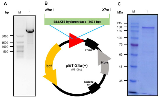 Cloning of hyaluronidase gene from P. residui BSSK58 and SDS–PAGE showing affinity purification fractions of BSSK58 hyaluronidase. (A) Lane M, DNA ladder marker; lane 1, BSSK58 hyaluronidase gene. (B) pET-24a/BSSK58 hyaluronidase recombinant vector diagram. (C) Lane M shows protein marker; lane 1 shows purified hyaluronidase with relative molecular weight of 170 kDa.