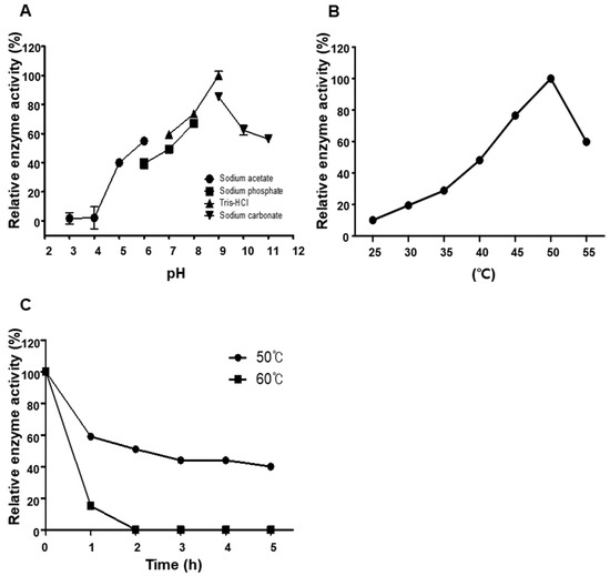 Optimal pH and temperature and thermal stability of BSSK58 hyaluronidase. (A) Enzyme activity across pH range of 3.0–11.0. (B) Activity at different temperatures (25–55 °C). (C) Thermal stability after 1 h of incubation at 50 °C and 60 °C.