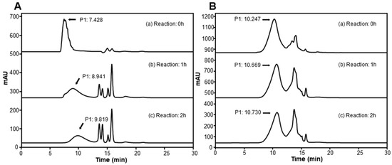 GPC analysis of BSSK58 hyaluronidase’s enzyme activity for HMW-HA and chondroitin sulfate. (A) In the enzymatic reaction with HMW-HA, the major retention time (RT) peak (P1) was found to shift from 7.4 min to 9.8 min. (B) In the reaction with chondroitin sulfate, the major RT peak (P1) was found to shift from 10.2 min to 10.7 min as the reaction progressed.