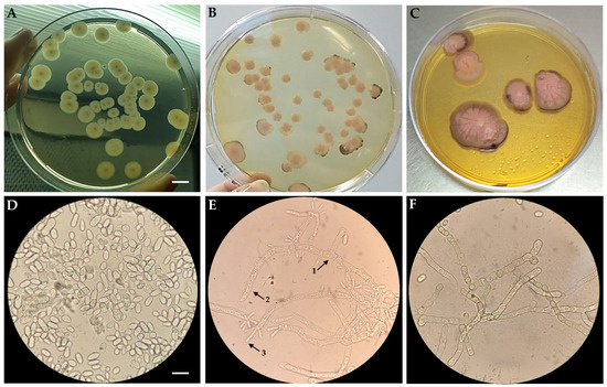 Macromorphology of A. pullulans strain m11-2 grown on YPD medium at 28 °C after 7 days of incubation (A), and after storage at 4 °C for 30 (B) and 60 days (C). Microscopic observation of the yeast phase (D), showing budding vegetative cells (blastoconidia); filamentous phase (E), showing septate reproductive hyphae (1), intercalary conidiophores (2), and terminal conidiophores with endoconidia (3); and dimorphic phase with both yeast and filamentous structures (F). Scale bars: (A–C) = 5 mm; (D–F) = 20 µm.
