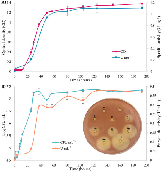 Cell growth dynamics and pectinase production by A. pullulans m11-2 in citrus pectin medium over 8 days of incubation at 28 °C and 110 rpm. (A) Optical density curves (OD at 600 nm) and specific pectinase activity (U mg−1 of protein). (B) Cell growth curves (CFU mL−1) and total pectinase activity (U mL−1), along with the results of the qualitative assay on solid medium, evidenced by the formation of clarification halos in each well, corresponding to the time points indicated (in hours). Vertical bars represent standard deviations (n = 3).