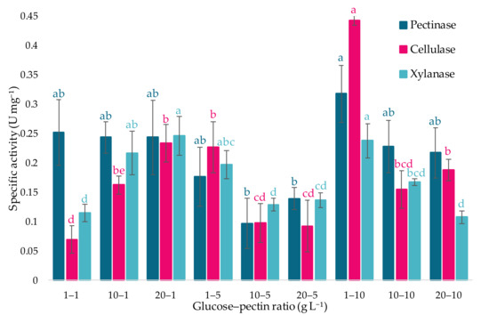 Comparison of the specific activities (U mg−1 protein) of pectinases, cellulases, and xylanases from the A. pullulans strain m11-2 under different glucose and pectin concentrations as carbon sources. Values are means from three independent experiments and the vertical bars represent standard deviation (SD). Letters above the bars indicate significant differences among the same enzymes according to ANOVA (α = 0.05).