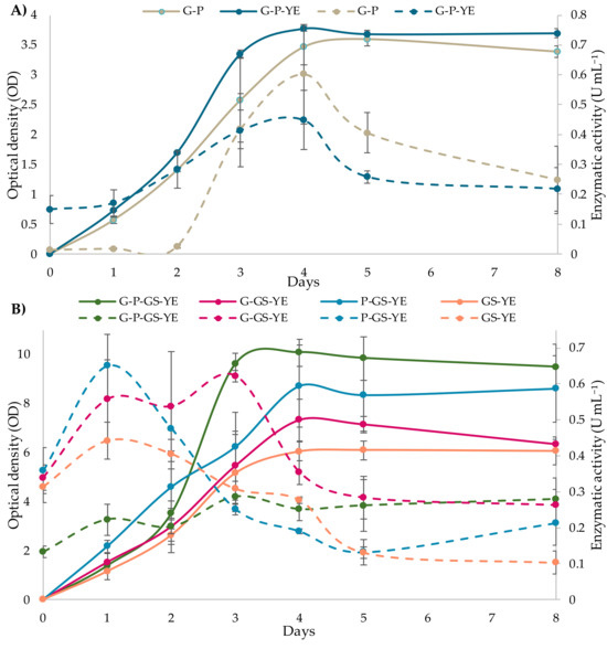 Growth curves and pectinase production of Aureobasidium pullulans m11-2 under different culture medium conditions. Solid lines correspond to cell growth (OD), while dotted lines represent pectinase activity (U mL−1). (A) Influence of yeast extract (YE) as a complementary nitrogen source. (B) Influence of grape skins on microbial growth and enzymatic production. G: 1 g L−1 glucose; P: 10 g L−1 pectin; GS: 15 g L−1 grape skins; YE: 1 g L−1 yeast extract. Values are means from three independent experiments and the vertical bars represent standard deviation (SD).