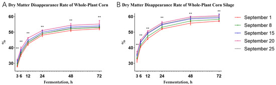 Dry matter disappearance rate of whole-plant corn and whole-plant corn silage (%). (A) Dry matter disappearance rate of whole-plant corn; (B) dry matter disappearance rate of whole-plant corn silage. Note: ** indicates an extremely significant difference (p < 0.01).