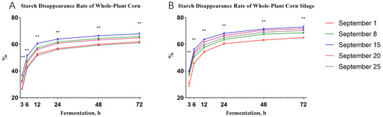 Starch disappearance rate of whole-plant corn and whole-plant corn silage (%). (A) Starch disappearance rate of whole-plant corn; (B) starch disappearance rate of whole-plant corn silage. Note: ** indicates an extremely significant difference (p < 0.01).