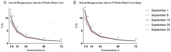 Starch disappearance speed of whole-plant corn and whole-plant corn silage (%/h). (A) Starch disappearance speed of whole-plant corn; (B) starch disappearance speed of whole-plant corn silage. Note: ** indicates an extremely significant difference (p < 0.01).