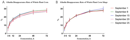 Gliadin disappearance rate of whole-plant corn and whole-plant corn silage (%). (A) Gliadin disappearance rate of whole-plant corn; (B) gliadin disappearance rate of whole-plant corn silage.