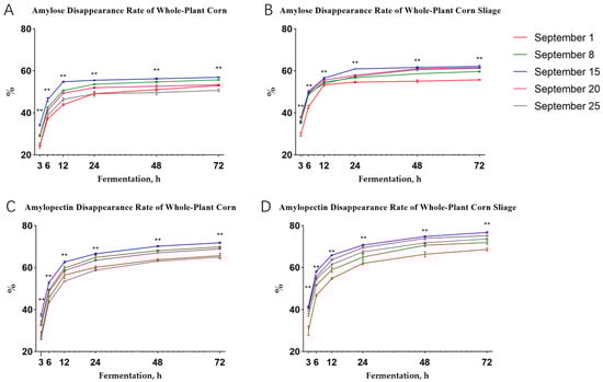 Amylose and amylopectin disappearance rate of whole-plant corn and whole-plant corn silage (%). (A) Amylose disappearance rate of whole-plant corn; (B) amylose disappearance rate of whole-plant corn silage; (C) amylopectin disappearance rate of whole-plant corn; (D) amylopectin disappearance rate of whole-plant corn silage. Note: ** indicates an extremely significant difference (p < 0.01).