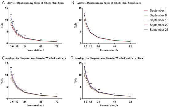 Amylose and amylopectin disappearance speed of whole-plant corn and whole-plant corn silage (%/h). (A) Amylose disappearance speed of whole-plant corn; (B) amylose disappearance speed of whole-plant corn silage; (C) amylopectin disappearance speed of whole-plant corn; (D) amylopectin disappearance speed of whole-plant corn silage. Note: ** indicates an extremely significant difference (p < 0.01).