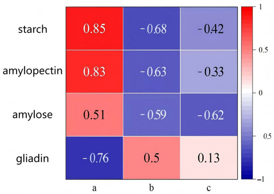 It can be seen in Figure 7 that the starch content and starch structure in whole-plant corn and whole-plant corn silage are positively correlated with the rapid starch degradation parameter a, but the gliadin content is negatively correlated with the rapid starch degradation parameter a. Among them, the starch content and amylopectin content have positive correlation coefficients of 0.85 and 0.83, but the gliadin content has a negative correlation coefficient of −0.76. The starch content and starch structure in whole-plant corn and whole-plant corn silage showed a negative correlation with the starch slow degradation parameter b, the gliadin content showed a positive correlation with the starch slow degradation parameter b, and the gliadin content showed a weak positive correlation. Among them, the starch content and amylopectin content had strong negative correlation coefficients of −0.68 and −0.63, and the gliadin content had a weak positive correlation coefficient of 0.50. The degradation parameter c was negatively correlated with the starch content, amylose content, and amylopectin content. The amylose content had a negative correlation coefficient of −0.62 with the degradation parameter c.