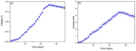 The increase in voltage profiles is shown in Figure 2a, where the maximum profile was observed on day 26 (0.921 ± 0.022 V) and then gradually decreased until day 35 (0.842 ± 0.29 V). Microbial fuel cells generate voltage due to the potential difference that occurs at the electrodes (anodic and cathodic); this increase results from electrochemical reactions (redox reactions) that occur on the surfaces of the electrodes []. As these reactions decrease, the voltage profiles also decrease []. The decrease in voltage and current from day 26 onwards may be linked to the accumulation of metabolites produced by Aspergillus ochraceopetaliformis within the MFC system. This phenomenon has been reported in previous studies on MFCs utilizing fungi and other electrogenic microorganisms []. Kižys et al. (2024) used the fungus Saccharomyces cerevisiae in their microbial fuel cells, managing to generate 0.120 V. They noted that the use of metallic nanoparticles in the anodic electrode tends to increase electrochemical reactions, leading to a rise in voltage []. Similarly, Moubasher et al. (2024) used the fungus Monodictys castaneae in their microbial fuel cells, achieving a maximum voltage of 0.807 ± 0.002 V. They mentioned that the reduction in voltage profiles is due to a decrease in the metabolic activity rate of the fungus, influenced by factors such as temperature and pH [].