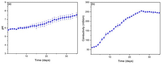 The pH profiles are shown in Figure 3a, depicting an increase from day 1 (5.772 ± 0.275) to day 35 (7.526 ± 0.467), with the optimum pH observed on day 26 (7.059 ± 0.381). Literature reports indicate that an optimal pH is crucial for maximizing electricity production; if the pH is too high or too low, it can inhibit the growth and activity of fungi, reducing the efficiency of the MFC [,]. Additionally, pH can affect nutrient solubility and electron availability, impacting cell performance. As eukaryotic organisms, fungi have an optimal pH range for their growth and metabolic activity []. Thulasinathan et al. (2021) used the fungus Psathyrella candolleana in their MFCs, which operated at a pH of 5.6, noting that pH profiles influence oxygen reduction reactions in the cathode chamber, thereby affecting the performance of the MFC []. Raqba et al. (2022) employed the fungus Trichoderma harzianum in their microbial fuel cells for acetaminophen reduction, initially operating at a pH of 2 before reaching a neutral pH, where the MFC displayed its best profiles []. During monitoring, an increase in electrical conductivity profiles was observed from the first day (61.262 ± 0.068 mS/cm) to the twenty-sixth day (254.789 ± 6.957 mS/cm) and then a slight detachment until the last day (254.789 ± 9.871 mS/cm).