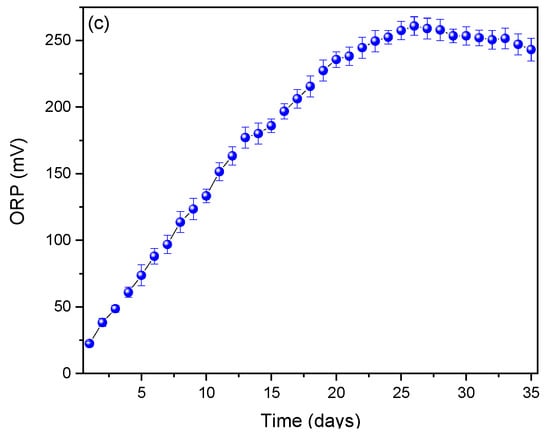 Electrical conductivity profiles affect the efficiency with which electrons are transferred between microorganisms and electrodes, influencing the amount of electricity generated. Higher electrical conductivity allows for more efficient electron transfer, which can increase electricity production []. Fungi can produce metabolites (such as organic acids) that affect the conductivity of the medium []. Arulmani et al. (2021) used Ralstonia sp. as an electrogenic bacteria in their MFCs to generate electricity, achieving 0.610 V and showing an electrical conductivity of 160 mS/cm []. They noted that microorganisms can create compounds that alter the conductivity of the electrolyte by influencing its viscosity or ionic composition []. The oxidation–reduction potential (ORP) is shown in Figure 3c, where it can be observed that the profiles increase from day 1 (22.488 ± 1.685 mV) to day 26 (260.837 ± 10.857 mV) and then slightly decrease until day 35 (243.095 ± 19.859 mV). Fungi act as biocatalysts, facilitating redox reactions through their metabolic processes, where an appropriate ORP favors electron transport from the fungi to the anode. Conversely, an inadequate ORP can inhibit their metabolic activity [,]. Fungi such as Aspergillus niger and Trametes versicolor have been reported to be more effective in environments with specific ORPs due to their extracellular enzymes (e.g., laccases and peroxidases) that participate in redox reactions []. Furthermore, an ORP gradient between the anode and the cathode is essential to generate a constant flow of electrons [].