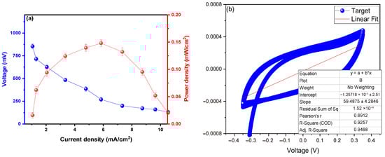 The power density profiles as a function of current can be observed in Figure 4a. A maximum power density of 0.148 ± 0.09 mW/cm2 is shown, with a corresponding current density of 5.847 mA/cm2 and a peak voltage of 853.604 ± 25.155 V. Previous studies have indicated that fungi decompose organic substrates and generate electrons that are transferred to the anode. The power density profiles depend on the metabolic capacity of fungi to oxidize organic compounds [,]. Additionally, fungi such as Trametes versicolor (laccase producers) or Aspergillus niger are efficient in redox reactions, which favors higher power densities []. Environmental conditions, such as pH, temperature, and nutrient availability, also directly influence the activity of fungi and, therefore, the power density []. Lin et al. (2021) used the fungus Pleurotus eryngii as a biocatalyst for copper removal in microbial fuel cells, achieving a power density of 41.3 mW/m2, and mentioned that incorporating redox mediators (natural or synthetic) can improve electron transfer []. Bashir et al. (2021) used the fungus Saccharomyces cerevisiae as a biocatalyst to generate electrical energy in their microbial fuel cells, noting that electrodes with high electrical conductivity and large surface area, such as those made of carbon nanotubes or graphene, favor a higher power density []. Similarly, Votat et al. (2024) used the fungus Trichoderma harzianum as a biocatalyst in their microbial fuel cells, managing to generate 4.1 mW/m2 []. They mentioned that in systems with fungi, high power density must be accompanied by stability over time, as factors such as the accumulation of metabolic byproducts, electrolyte degradation, or system contamination can negatively affect stability [].