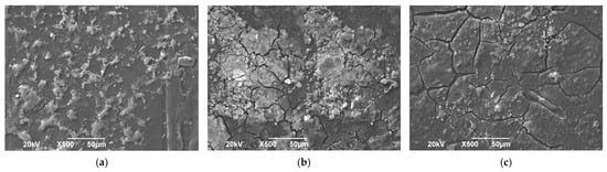 Figure 6 presents micrographs of biodegradable plastic samples treated with Aspergillus ochraceopetaliformis in different configurations of MFCs. In the micrograph corresponding to MFC-1, the surface shows initial irregularities and signs of fragmentation, indicating the beginning of the biodegradation process. The image of MFC-2 reveals more advanced degradation, with loose particles and noticeable alterations in the plastic’s morphology. Finally, MFC-3 exhibits a highly fractured surface with large cracks and disintegrated structures, suggesting significant polymer degradation. The phenomena observed in this process can be explained by the enzymatic activity of A. ochraceopetaliformis, which produces enzymes capable of breaking down the polymer chains of biodegradable plastic []. These enzymes decompose polymers into smaller molecules, facilitating their absorption by the fungus as a carbon and energy source []. Additionally, the MFC configuration introduces an additional process: microbial activity within the cell generates electrons that can be captured for electricity production. This dual function makes the system a sustainable alternative for plastic degradation with energy-related benefits [,]. The presence of cracks in the micrographs indicates an accelerated biodegradation process, potentially enhanced by environmental factors such as humidity, temperature, and the type of plastic used []. Figure 6 demonstrates that the integration of fungi into MFC systems could offer an innovative solution for plastic reduction, generating positive impacts both in waste elimination and renewable energy production.