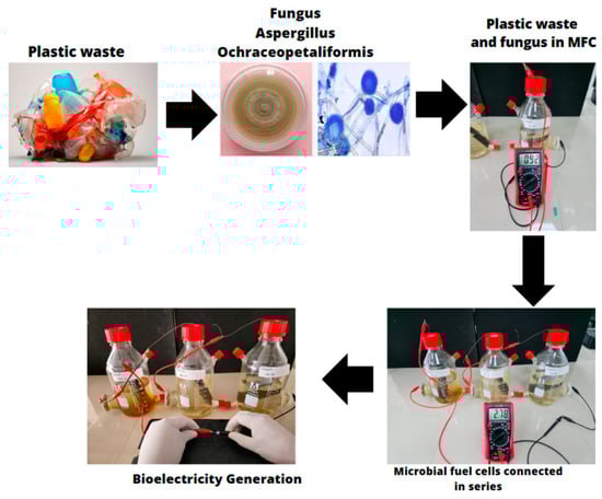 The primary objective of this research is to utilize the fungus Aspergillus ochraceopetaliformis as a plastic biodegrading agent in single-chamber microbial fuel cells. The aim is to observe its potential for generating electrical energy while simultaneously biodegrading plastic over 35 days. The study involves the molecular identification of the fungus and the measurement of various parameters, including power density, voltage, current density, electric current, pH, electrical conductivity, reduction–oxidation potential, electrical resistance, FTIR spectrum, and micrographs of the plastic sample used. Although using microorganisms for plastic biodegradation is still an emerging technology, it holds significant promise for reducing plastic waste and mitigating its environmental impact. With ongoing advancements in research and development of biotechnologies, we may fully harness the potential of these microorganisms in the fight against plastic pollution.